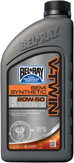 Caracteristicas: Exclusive Bel-Ray anti-wear chemistry reduces bearing and valve train wear and keeps pistons and rings from scuffing Flash point is higher than standard petroleum-based oils which limits oil burn-off to lower oil consumption and keeps hot engines protected Features high-polarity synthetic-base oils, which provide minimum friction for increased power Removes deposits, dissipates heat and lowers friction to reduce engine operating temperature Offers many of the benefits of Bel-Ray V-Twin Synthetic Motor Oil but at a more economical price
