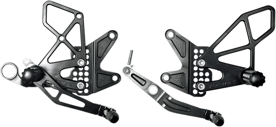Caracteristicas: CNC-machined from solid billet aluminum; lighter and stronger Version 2 has a new adjustment design that allows for more footpeg and toe peg positions Race grip footpegs offer traction for the most rigorous riding Dual-roller bearings in each lever allow for ultra precise shifting and braking Anodized black finish Made in the U.S.A. Footpegs remove from the front for quick replacement 3D-machined heel guards