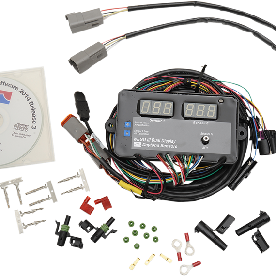Caracteristicas: Sold in a system that includes WEGO III Wide-Band Exhaust Gas Oxygen Sensor Interface, 42" harness, Bosch LSU 4.2 five-wire wide-band oxygen sensor, 18x1.5mm weld nut for mounting sensor on exhaust pipe and software on CD ROM WEGO III data logging software runs under Windows ME/XP/Vista; software allows AFR, engine rpm and analog sensor data with user-defined scaling; data can also be exported to Excel for further analysis Displays AFR (air/fuel ratio) and logs more than two hours data including AFR and engine rpm; spare 0-5V analog input for sensors such as throttle position or manifold pressure Wide supply voltage range from 11-16V allows operation from battery on small engines and race vehicles without an alternator; current drain is approximately 1 amp Waterproof, ultra-bright, daylight-readable blue LED display with automatic dimming under low-light conditions Can be used for on-road or dyno testing; suitable for motorcycle and other small engine applications Highly accurate with less than +/-0.10 AFR error over 10.3-19.5 AFR range Easy free-air calibration procedure corrects for sensor aging effects Complete fuel/air ratio metering system with built-in data logging 0-5V analog AFR output for interface to dyno instrumentation Compact size: 4" L x 2" W x .5" H Made in the U.S.A.