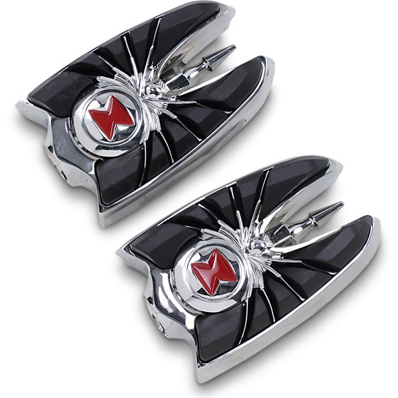 Caracteristicas: Full custom footpeg design Ominous black widow design nestled in the rubber pads Footpegs with male-mount ends require male-mount footpeg adapters Footpegs without male-mount ends require the use of Kuryakyn footpeg adapters