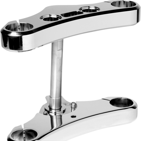 Caracteristicas: Manufactured from billet aluminum Bottom headlight mount Has fork lock capability All hardware is stainless steel Made in the U.S.A. Raked triple trees change the handling characteristics of the motorcycle. Steering geometry must be calculated to determine which degree of rake is most suited for your application. Trees with more than 3° of rake should not be used in stock frame applications.