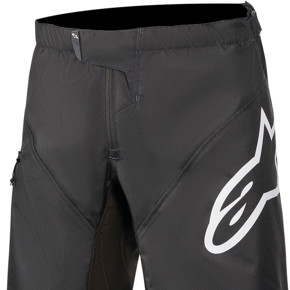 Caracteristicas: Constructed from lightweight, advanced poly-fabric to promote moisture wicking Side patches on high-abrasion areas Hook-and-loop closure waist adjustment with TPR pullers Zippered side pockets and back pocket Stretch material on the crotch and back yoke, with strategically positioned Spandex for mobility Laser-cut front air vents Flat snap connection for compatibility with Alpinestars inner shorts Welded hems for durability