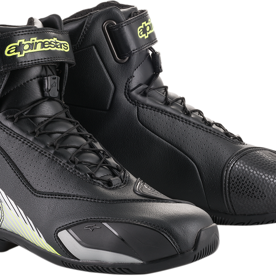 Caracteristicas: Microfiber upper Perforated microfiber panels on lateral and medial quarter areas plus medial side perforation zone for enhanced airflow Tongue is made with breathable mesh to improve airflow Rear accordion panel is lightweight padded material Speed lacing system derived from Alpinestars MotoGP technology for a quick, precise, secure closure Ankle opening closure system using a hook-and-loop strap with debossed Alpinestars logo Foam-backed double-density ankle disc guards mounted under the upper boot layer Thermoplastic Rubber (TPR) guards in key areas for impact resistance and flexibility External TPR toe reinforcement for abrasion resistance Welded reflective insert on rear improves visibility in low-light conditions Thermoplastic Polyurethane (TPU) heel counter guards against impacts and abrasion Internal toe box reinforcement layered under the shoe microfiber outer layer Breathable textile lining with anti-sliding microfiber suede at the heel Removable anatomical EVA foam footbed Vulcanized rubber sole compound