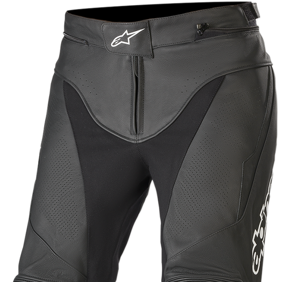 Caracteristicas: Premium leather main chassis constructed from 1.3 mm genuine bovine leather Accordion leather stretch zones above the knee offer improved flexibility Extended high rear waist construction provides greater overlap with the riding jacket Large stretch panels on calf area for improved fit and feel Pre-curved leg construction helps prevent riding fatigue and aids performance fit Waist circumference adjustment Waist connection zipper allows attachment to Alpinestars riding jackets Internal mesh lining with stretch panel inserts work in conjunction with outer stretch zones for freedom of movement Internally reinforced seat and knee area Alpinestars GP-R protection on knee Replaceable Sport knee sliders for excellent impact and abrasion resistance Dynamic Friction Shield (DFS) external dual density Thermoplastic Polyurethane (TPU) sliders on knees