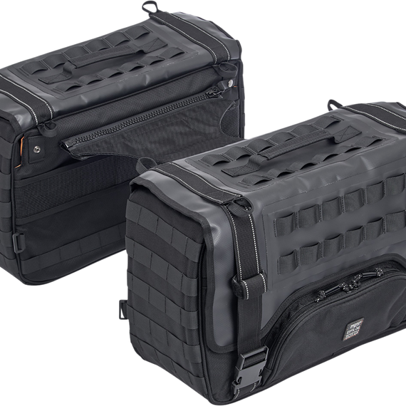 Caracteristicas: Engineered for easy installation and universal fit on a wide range of motorcycles UV-treated 1680-denier ballistic nylon exterior resists moisture and fading Strong, flexible EVA foam panels inside main compartment add structure and durability PVC-treated waterproof security flap over main compartment closes with 1.5-inch wide (36mm) reflective polyester straps and Duraflex quick-release buckles Extra-large 15” long x 7” wide PVC-treated main compartment door features double zippers with single paracord pull for speedy operation MOLLE system on exterior provides options for attaching accessories and extra gear Two-piece mounting yoke with adjustable hook and loop panel fastens to both bags with heavy-duty nylon zippers Bag bottoms reinforced with heat-resistant, heavyweight canvas panels Main compartment features three elastic mesh pockets and one vertical pocket Adjustable straps inside main compartment to secure rolled clothing, fuel bottle, or other gear Mesh document pocket with two zippers inside waterproof security flap High-vis orange interior lining makes spotting contents easier Hidden cable port into main compartment—perfect for charging devices 15.25” wide x 7.25” deep (388mm x 184mm) exterior pocket beneath security flap for documents and small essentials 9” wide x 4.5” tall (240mm x 114mm) clamshell pocket with double zipper pulls beneath security flap is accessible without opening the main compartment Double-sided straps included for securing bag to appropriate mounting points on motorcycle Universal fit works with a variety of aftermarket saddlebag supports Multiple D-rings, MOLLE points, and high-strength nylon loops on exterior provide options for carabiners/bungee cords Hand-sewn seams with high-strength polyester thread Waterproof nylon rain covers with elastic gathers and drawstring closure provide extra protection in extreme conditions