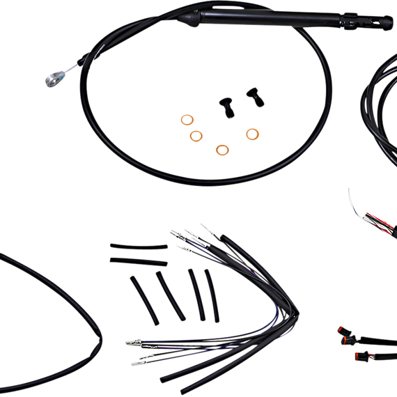 Caracteristicas: Complete cable/line installation kits Kits include extended brake line, extended clutch cable/clutch line, extended throttle/idle cables as required and all necessary wiring extensions Brake lines feature PTFE inner liner and heavy-duty stainless steel outer braid Made in the U.S.A. Kits are based on using 2” risers with Ape hanger-style handlebars