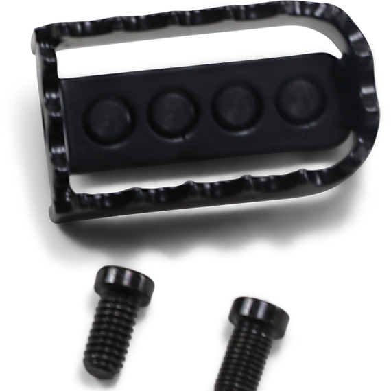 Caracteristicas: The perfect match for MX-style foot pegs Inspired by motocross bikes and designed to fit your street machine Feature a serrated edge on top and a rubber pad on the bottom for boot protection Powder-coated in satin black to blend nicely to your bike