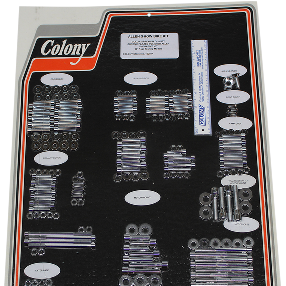 Caracteristicas: Complete set of engine bolts for mounting rocker box, primary cover, lifter base, transmission covers, oil pump, air cleaner, cam cover, point cover, timing plug, and motor mounts