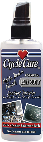 Caracteristicas: Cycle Care® Ruff-Cutt is a spray-on, wipe-off instant detailer specifically formulated for denim finish colors No-gloss/streak formula that self-levels while cleaning, leaving a natural, flat denim finish Ruff-Cutt is also a detailer for other surfaces on the motorcycle (e.g. windshields and chrome) Provides easy removal and protection for bugs, dirt and tree sap