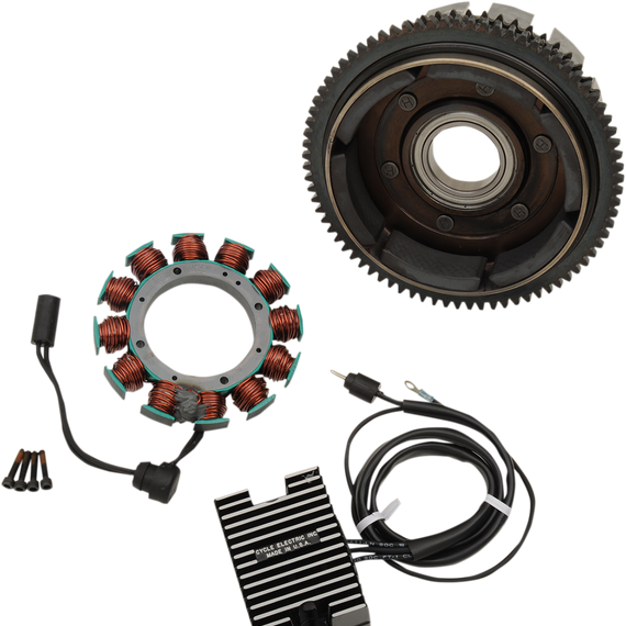 Caracteristicas: Kits include stator, rotor, black rectifying voltage regulator and mounting hardware Made in the U.S.A. Adding electrical accessories increases amperage usage. When doing so, it is important to consider amperage ratings of switches and wires. If you draw too many amps through a switch or wire, it will heat up and may burn. Fuses and breakers are sized to protect wiring and switches. DO NOT CHANGE 30A MAIN BREAKER TO A 50A BREAKER. THE SWITCHES AND WIRING WILL NOT BE PROTECTED.