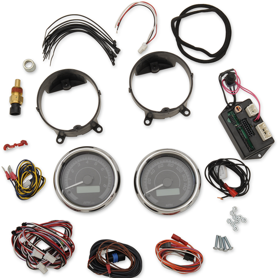 Caracteristicas: New MVX Series Analog/Digital Bagger Gauges offer two bezel options, four background choices, and seven lighting colors to choose from - the combinations are nearly endless Whether installing a six-gauge set, or building your perfect gauge set from Dakota Digital's optional gauges, you will get all seven gauge readings displayed in the speedometer and tachometer LCD readouts (speed, rpm, volts, fuel, oil pressure, oil temp, and air temp), as well as miles to empty, and performance readouts (0-60 time, and quarter-mile speed and time) Personalize your gauge set by programming the pointer, backlight, and LCD message center colors independently Six-gauge kits include speedometer, tachometer, oil pressure, oil temperature, fuel level, and voltmeter Two-gauge kits include speedometer and tachometer (will display other gauge readouts in odometer) Optional fuel level gauges, oil pressure gauges, oil temperature gauges and voltmeter can only be used with MVX six- and two-gauge kits; they will not work alone Seven user-selectable LED lighting colors available for background, message, and pointer: red, green, blue, teal, magenta, amber or white Proudly designed and manufactured in the U.S.A. Plug directly into the MVX and MCL-3014 series gauges and add readings for up to two air suspension pressure, boost pressure, or compass heading into the existing LCD displays of the speedometer and tachometer This makes it extremely easy to add these gauge readings without having to remove any of your existing MVX gauges