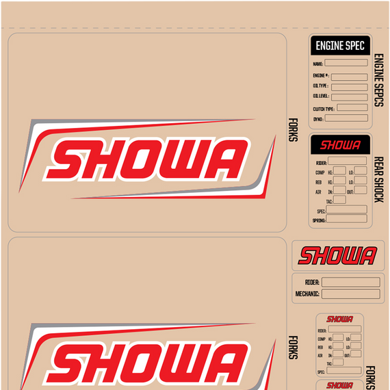 Caracteristicas: Contain forks, shock and suspension settings and engine settings decals Factory look "spec decals" for rider specific settings Write down your settings like the factory race teams do Printed on clear, 15-mil vinyl