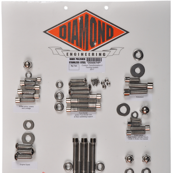 Caracteristicas: Customize a bike without having to completely disassemble it Kit adds detail and a custom look with ease Groups of polished stainless steel fasteners covering many visible areas of the motorcycle Front fender mount and trim, rear saddlebag supports, floorboards, engine guard, triple tree pinch, fork tube covers, axle cap, Wiring harness tab on frame neck, mirrors, kickstand, shifter arm, levers & linkage, brake pedal, Rear master cylinder, mount, cover & brake line bracket, crankcase (visible bolts only), starter Made in the U.S.A.