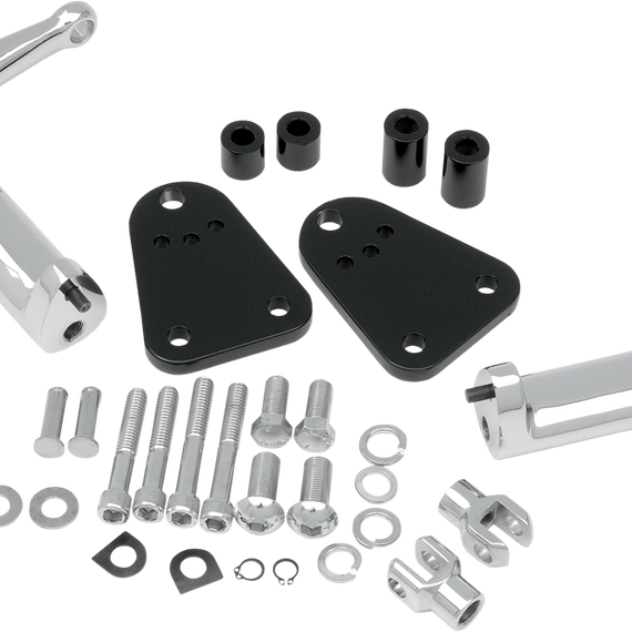 Caracteristicas: Features black-finished mounting brackets and chrome footpeg arms and clevises Footpeg mount arms are adjustable and can be mounted in three pre-set positions to match the rider height and preferred riding position Includes all required mounting hardware; visible hardware is chrome-plated Footpegs not included; accepts most male mount pegs