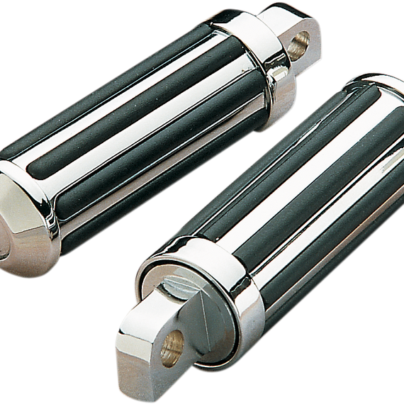 Caracteristicas: Another unique design from Drag and Arlen Ness Protective rubber rails run completely around diameter for great looks no matter how pegs rotate or pivot Each is precisely die-cast, chrome-plated aluminum End cap is super-clean and uses a grade 8 countersunk flat-head socket screw Very tight tolerances ensure a great-quality, super strong footpeg assembly Carbon-steel pivot ends are stronger than other die-cast pivots Peg diameter is 1.5" (between a standard large-size driver and the smaller passenger-style pegs); length is 4" without pivot end Shifter peg matches footpegs