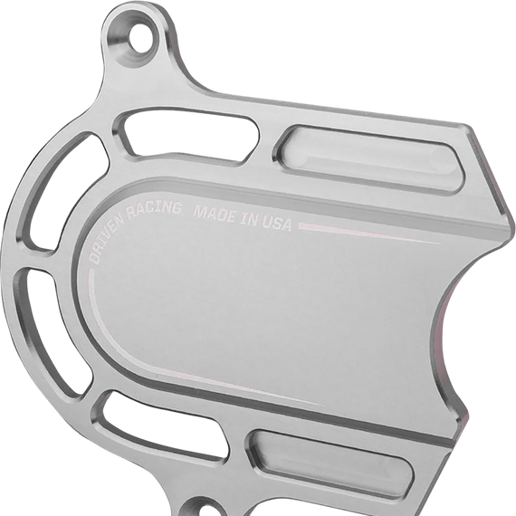 Caracteristicas: Driven sprocket cover machined out of 6061-T6 alloy Anodized finish with the Driven logo etched on the cover Replaces the plastic cover on bike Made in the U.S.A.