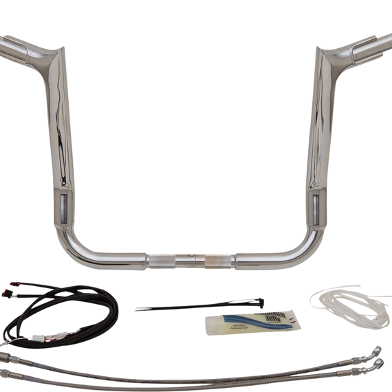 Caracteristicas: Adjustable 1-½” collar next to handlebar controls for custom look Revolutionary bolt-together two-piece handlebar design that takes up half the shelf space, is easy to ship and even faster to install CNC mandrel-bent from 1-1/2" diameter x .095" wall heavy tube EZ install means no more need to fight internal wiring; install handlebar wiring in minutes Billet machined top with a large internal machined radius allows for EZ pulling of wiring (non-welded top corner) Install kits include everything needed to install the handlebars in half the time of other kits due to our design that only extends the existing clutch cable/ clutch line and brake lines Handlebars are knurled and notched for TBW applications Made in the U.S.A. Accepts OEM heated grips Patent No. 10,946,926