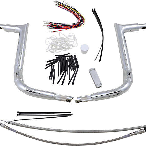 Caracteristicas: Adjustable 1-½” collar next to handlebar controls for custom look Revolutionary bolt-together  two-piece handlebar design that takes up half the shelf space, is easy to ship and even faster to install CNC mandrel-bent from 1-1/2" diameter x .095" wall heavy tube EZ install means no more need to fight internal wiring; install handlebar wiring in minutes Billet machined top with a large internal machined radius allows for EZ pulling of wiring (non-welded top corner) Install kits include everything needed to install the handlebars in half the time of other kits due to our design that only extends the existing clutch cable/ clutch line and brake lines Handlebars are knurled and notched for TBW applications Made in the U.S.A. Accepts OEM heated grips Patent No. 10,946,926