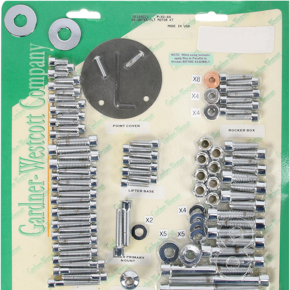 Caracteristicas: Motor sets include cam cover, primary cover, transmission side cover, oil hose cover, lifter base, rocker box, front inner primary, washer, motor and transmission mount bolts Side cover sets include cam, primary, oil hose cover and transmission side cover Primary sets include primary, inspection and derby covers Made in the U.S.A.