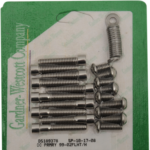 Caracteristicas: Motor sets include cam cover, primary cover, transmission side cover, oil hose cover, lifter base, rocker box, front inner primary, washer, motor and transmission mount bolts Side cover sets include cam, primary, oil hose cover and transmission side cover Primary sets include primary, inspection and derby covers Made in the U.S.A.