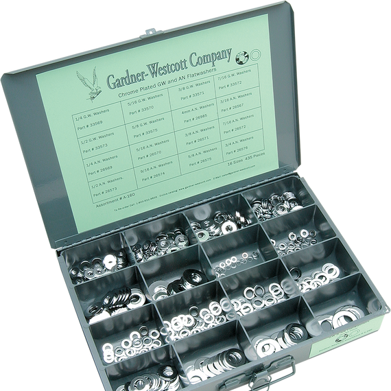 • Kit includes a 16-compartment steel tray with a 435-piece assortment of washers