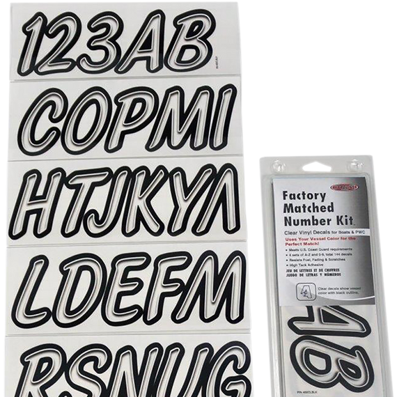 Caracteristicas: 3" H letter and number kits coordinate with your watercraft graphics for a killer look Kit contains 146 decals: four sets of A-Z, four sets of 0-9 and two Hardline Products decals