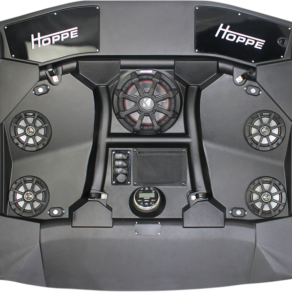 Caracteristicas: Solid top with media options and features for convenience you never expected from your UTV The Audio Shade is decked out with the Kicker® KMC2 Media Center, amps, and multiple speaker configurations to choose from The Audio Shade also comes with built-in LED light bars, interactive interior lights, and other convenient features to complete your off-road adventure, day or night Front 31" 150W sleek, high output single row LED light bar Rear 11" 50W sleek, high output single row LED light bar Phone app-controlled (iPhone® & Android® compatible) - Lights dance to the beat of your music Backlit switches for light bars & interior lights - easily control your lights at night Kicker® KMC2 multimedia gauge-style marine receiver with Bluetooth® Bluetooth® audio streaming AM/FM digital tuner USB input, USB charging, RCA aux input (headphone jack), dual pre-amp outputs Kicker® 6.5" PS-Series speakers with titanium tweeters featuring neodymium magnets for high power with low weight Kicker® COMPRT 10" 400 W, 1 Ohm Subwoofer (on applicable models) - features ultra-thin design, dual voice coil, Extra large surround roll for deeper and smoother bass 500 watt Kicker® PX series mono subwoofer amplifier (on configurations with sub) 300 watt Kicker® PX series 4 x 75 watt full-range amplifiers (standard on all models) - weather resistant(IP66 rating) and active crossover Hand-laid reinforcement layered with directional fiber orientation for ultimate rigidity and strength, styled to match the bodywork Rigid design improves sound quality for the cleanest bass and crispest highs Strengthened edges to protect from tree branch strikes All cage clamp fasteners hidden on the top side for a smooth yet aggressive design (2) zipper pockets Hoppe Liner Coating for durable, all-weather protection