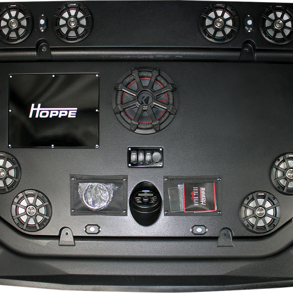 Caracteristicas: Fiberglass composite shell styled to match Mule Pro body lines Strengthened edges to protect from tree branch strikes All cage clamp fasteners hidden on top side for a smooth design Zipper pockets safely secure your phone on the most rugged trails Hoppe liner coating for durable, all-weather protection Front 31” 150W sleek, high output single row LED spot/floodlight bar Rear 11” 50W sleek, high output single row LED spot/floodlight bar (4) RGB LED Interior lights Phone app-controlled (iPhone® & Android® compatible) Lights dance to the beat of your music Backlit switches for light bars & interior lights for control at night Kicker ® KMC2 multimedia gauge-style marine receiver with Bluetooth® AM/FM digital tuner (LED lights may cause signal interference when activated with AM/FM tuner) AUX input (headphone jack) USB input & USB charging Kicker ® 6.5” PS-Series speakers Titanium tweeters Neodymium magnets for high power with low weight Lightweight, weather resistant polymer baskets Waterproof suspension system Kicker ® CompRT 10” 400 W, Dual voice coil subwoofer Ultra-thin design Extra-large surround roll for deeper, smoother bass Signature stitching on surround Kicker ® PX-Series amplifiers 500W – mono subwoofer amplifier 300W – 4 x 75W full-range amplifier Weather resistant (IP66 rating)