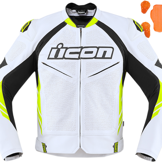 Caracteristicas: 1.1-1.3mm TracSpecª leather and textile, coupled with ICON's Attack Fit A full D3O¨ impact protector package (elbow, shoulder, back) and the accordion leather flex zones Deep chest pockets that double as chest vents, reinforced perforation zones, retro-reflective hits, and a padded microfleece comfort liner collar For the throttle jockey, we've added an internal waist zipper that connects to the Hypersport Primeª pant, perfect for track use. For sizing, please refer to the 2021 Helmet & Apparel catalog.