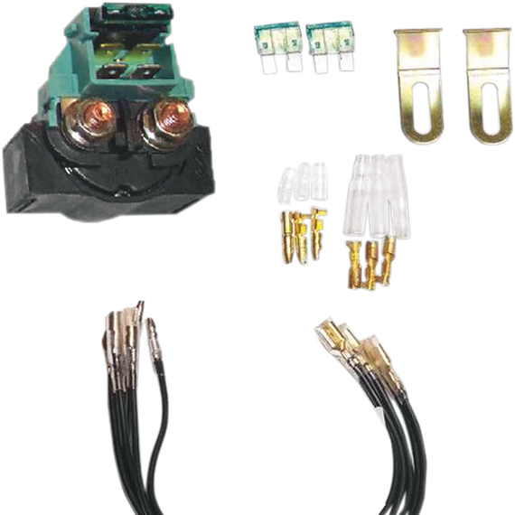 Caracteristicas: Features a 12V solenoid Includes starter relay, two metal brackets, three extra sets of terminal wires, three extra 30 amp blade-type fuses and five wires with terminals