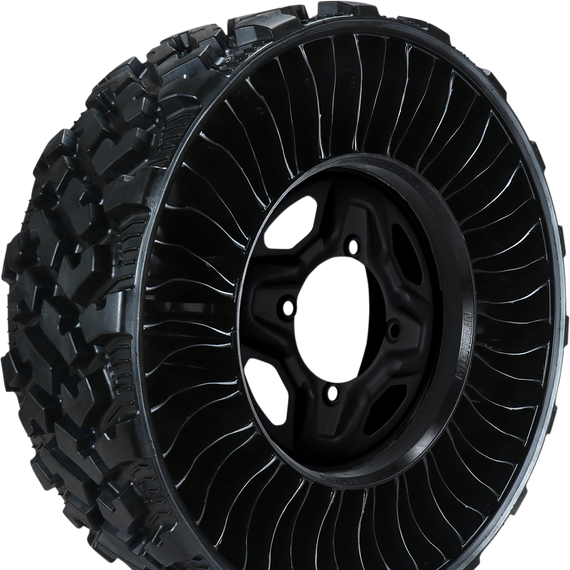 Caracteristicas: Zero-degree belts (under the tread) and proprietary design provide great lateral stiffness, while resisting damage and providing excellent cornering and side-hill stability High-strength, poly-resin spokes carry the load, absorb impacts and provide a unique energy transfer that reduces the "bounce" associated with pneumatic tires Michelin's proprietary Comp10 Cable™ forms a semi-rigid "shear beam", and allows the load to hang from the top No complex mounting equipment needed and once they are bolted on, there is no air pressure to maintain Designed specifically for difficult environments and conditions, rugged roads and jagged terrain Airless radial tire is one single unit with a heavy-gauge steel hub Not certified for use on public roads (NHS) Non-directional tread pattern Available in flat black Max Load/Speed 715 lb./50 mph Lug nut seat type 60 degree conical/tapered