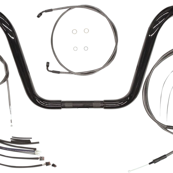 Caracteristicas: The only complete Handlebar Kits with matching braided cables and brake lines that include Magnum Caliber Handlebars Magnum 1-1/4" Caliber handlebars are manufactured with the highest quality construction, including machined control mounts (not swaged) and feature high luster finish for an unsurpassed appearance All handlebars are 1-1/4" diameter with 1" diameter center section and 3-1/2" on-center knurling, work with standard controls, including hydraulic clutch, and are machined for internal wiring and electric throttle control All Caliber Handlebars are preloaded with E-Z pull-thru sleeving to make wiring installations a breeze Kits include: Magnum 1-1/4" Caliber Handlebars, throttle and idle cables or throttle-by-wire extensions, a clutch cable or hydraulic clutch line, brake lines, copper crush washers, hardware, and any necessary switch wiring or turn signal extensions All cables are a low effort, high efficiency design that meets or exceeds all OE specifications for fitment, construction, endurance Kits for dual disc models include an all brazed manifold that eliminates leaks, alignment problems, and unattractive threaded connections Brake lines exceed all DOT FMVSS-106 requirements Assembled in the U.S.A. Caliber Handlebars have a 1" diameter center section and fit 1" risers. Models originally equipped with handlebars that have a center section diameter larger than 1" will require changing the risers to a 1" ID version. Examples would be, but not limited to FLSTF, FLSTFB and CVO models. Please check before ordering.