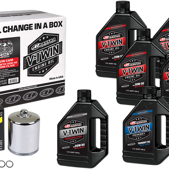 Caracteristicas: Comes with all necessary products to complete a full oil change Includes engine oil, transmission oil, primary oil plus a ProFilter oil filter in black or chrome and drain plug O-rings 4 quarts of Maxima V-Twin 100% synthetic 20W-50 engine oil 1 quart of Maxima V-Twin mineral transmission 80W-90 oil 1 quart of Maxima V-Twin mineral primary oil 1 ProFilter wrench-removal premium oil filter: black or chrome 3 drain plug O-rings Also available in a quick-change kit that does not include the items needed for the transmission/primary oil changes