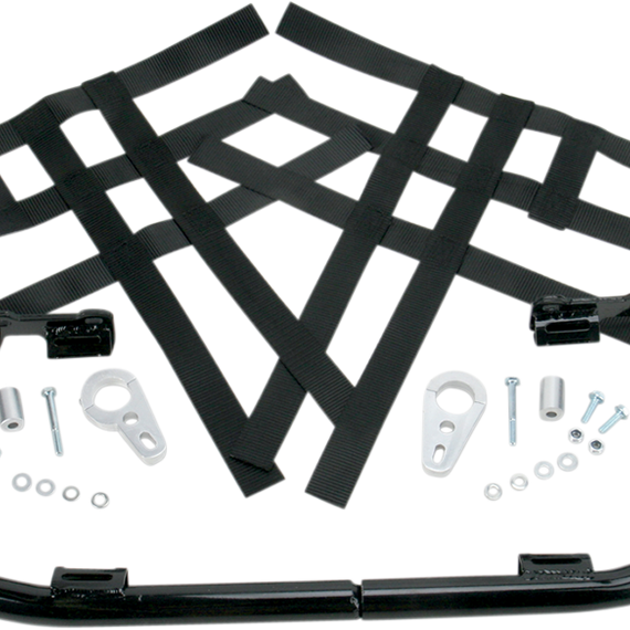 Caracteristicas: Manufactured from lightweight 1-1/4" extruded aluminum tubing Custom EZ-fit clamp brackets with silver anodized finish Wide 1-1/2" black webbing with beefy aluminum net tabs Sweep up from front to the rear for maximum ground clearance Maximum width of 50" to comply with ATVA rules Allows the use of OEM heel plate/fender extensions
