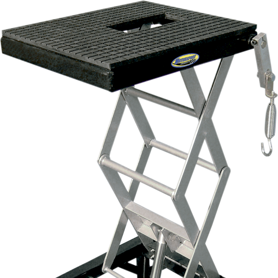 Caracteristicas: Professional-quality lift for dirt bikes from 50cc-650cc No loose parts - attached secure footpeg springs tighten automatically to pegs when stand rises to help stabilize bike Access hole in top measuring 3" x 7" Adjustable Safety Pin sets at multiple heights allowing for extra security