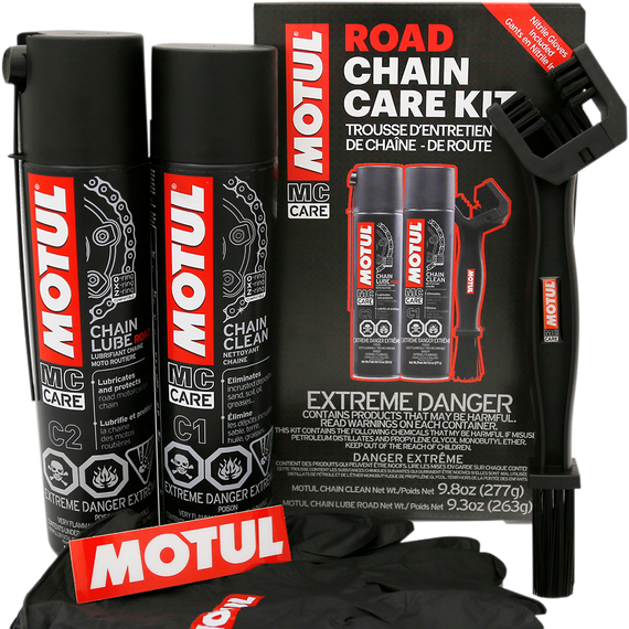 Caracteristicas: A complete kit for drive chain cleaning and lubrication, for either road or offroad applications I addition to the appropriate lubricant, each kit includes 9.8 oz can of Chain Clean (PART #3704-0169), chain brush, black nitrite gloves and Motul sticker