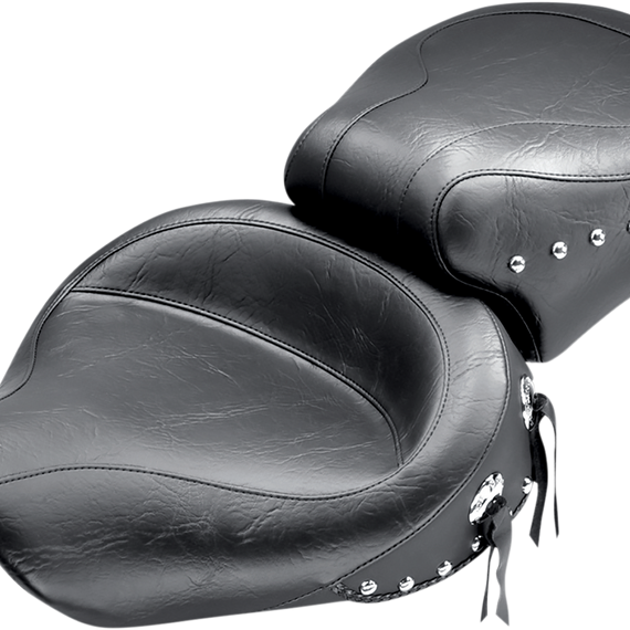Caracteristicas: Front bucket is trimmed with a functional skirt that comes down over the frame and fender for a clean, uninterrupted look Studded Naugahyde cover is trimmed with conchos tied with leather Vintage cover is made from highest quality expanded vinyl Passenger seat angles forward to support the rider's back Built on a single-piece steel base that fits like stock Made in the U.S.A.