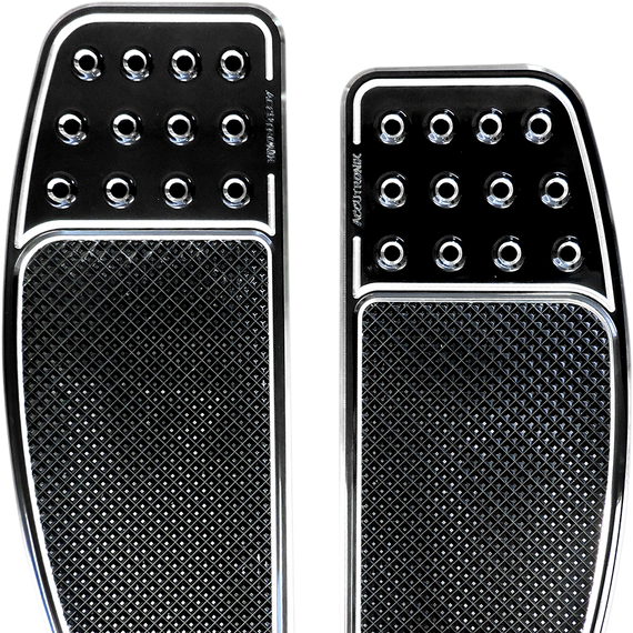 Caracteristicas: Replace the stock OEM front floorboards for a more custom look Extended 63.5 mm (2-1/2") in the front, and 19 mm (3/4") wider and 25.4 mm (1") longer in the rear Mounts like stock with stock hardware Machined with 6061 T-6 billet aluminum The top portion of the board has a raised hole feature inspired by racing pedals The lower area is a multi-directional, slip-resistant Machined Pyramid-Top Knurled design