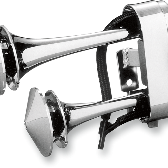 Caracteristicas: Waterproof dual-trumpet air horns give a loud warning blast of 128 dB Include horn assembly, air compressor, relay, simple wiring, cone-shaped dust/bug covers, mounting hardware and complete installation instructions Air horns mount to the frame down tubes or engine guards; air compressor mounts to the frame behind a side cover or under seat Use the stock horn button; bolt-on, plug-in installation