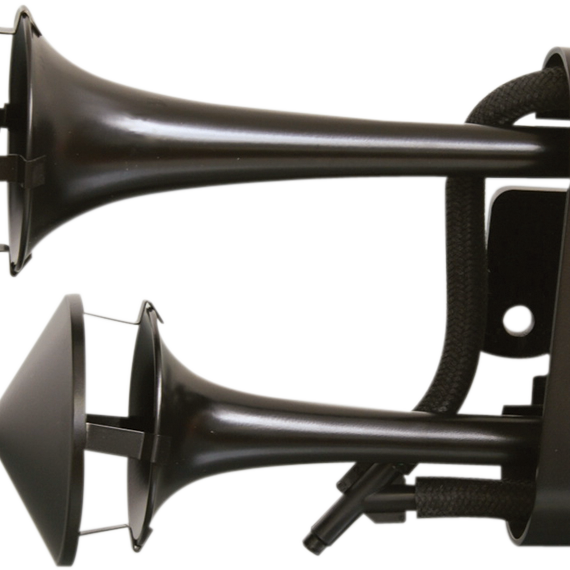 Caracteristicas: Waterproof dual-trumpet air horns give a loud warning blast of 128 dB Include horn assembly, air compressor, relay, simple wiring, cone-shaped dust/bug covers, mounting hardware and complete installation instructions Air horns mount to the frame down tubes or engine guards; air compressor mounts to the frame behind a side cover or under seat Use the stock horn button; bolt-on, plug-in installation