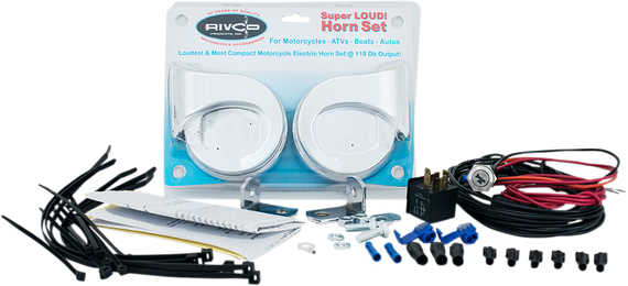 Caracteristicas: 2 Super loud 118 DB Electric Horns Water and mud resistant Include all wiring and easy to follow instructions Weight 2.6 lbs Dimensions 9 x 9 x 4 in