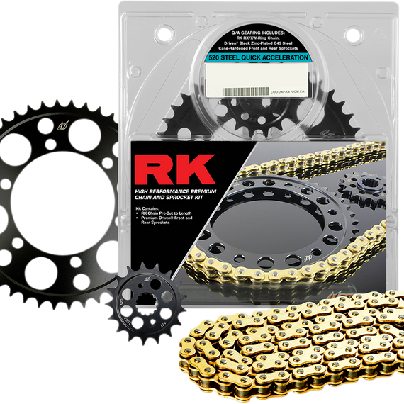 Caracteristicas: Kits includes a premium Driven® C45 steel alloy black case hardened rear sprocket paired with Driven® C45 steel case hardened and quenched front sprocket RK’s 520 Steel Quick Acceleration Race Kit combines the enhanced performance of race gearing and durability of steel components Kit includes a one-tooth-smaller-than-OE front sprocket