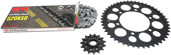 Caracteristicas: Kits includes a premium Driven® C45 steel alloy black case hardened rear sprocket paired with Driven® C45 steel case hardened and quenched front sprocket RK’s 520 Steel Quick Acceleration Race Kit combines the enhanced performance of race gearing and durability of steel components Kit includes a one-tooth-smaller-than-OE front sprocket