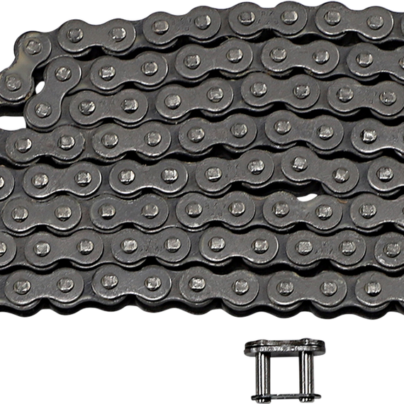 Caracteristicas: Heat-treated medium carbon alloy steel construction All components heat-treated and shot-peened for maximum strength Two-point pin riveting and solid rollers For motorcycles up to 500cc that did not come with an O-ring or heavy-duty chain as standard equipment Chains include clip connecting link