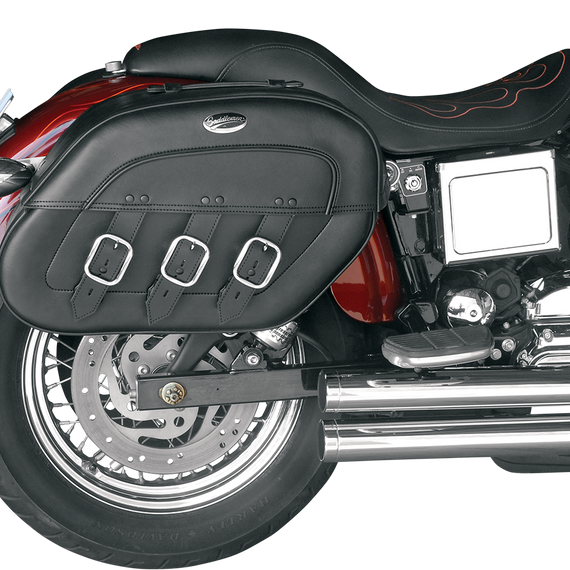 Caracteristicas: A truly portable luggage system, handles included; available in Drifter and Desperado styles Designed for heavier loads and maximum durability Specially built to fit bike perfectly; molded plastic frame slips over posts directly mounted to the fender struts Remove saddlebags easily by releasing two QTL (Quarter Turn Locking) pins found inside each bag Lockable, quick-release hidden buckles under each strap are easy to use; protect contents and prevent unauthorized removal of bags from bike Includes a chromed metal support that fits behind each bag for extra strength and security (also easily removed when bags are not to be used for an extended period) Inner stiffeners and rigid back maintain bag shape, even when empty Drifter features smooth, clean and uncluttered styling with three leather straps and buckles Desperado features chrome studs and three leather straps with buckles All necessary hardware, including turn signal relocators if needed, and instructions are included Made of water-resistant materials; cleans easily with a damp cloth, or for best results use Saddlemen's saddlebag cleaner and conditioner, available separately Custom-designed to fit exact models; bolt directly to motorcycle using saddlebag quick-disconnect mounting system Turn signal relocation required on some Harley applications; universal relocation kit included as required.