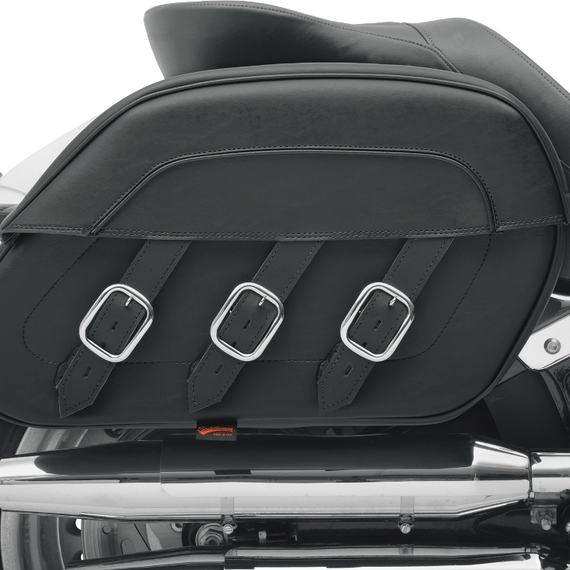 Caracteristicas: A truly portable luggage system, handles included; available in Drifter and Desperado styles Designed for heavier loads and maximum durability Specially built to fit bike perfectly; molded plastic frame slips over posts directly mounted to the fender struts Remove saddlebags easily by releasing two QTL (Quarter Turn Locking) pins found inside each bag Lockable, quick-release hidden buckles under each strap are easy to use; protect contents and prevent unauthorized removal of bags from bike Includes a chromed metal support that fits behind each bag for extra strength and security (also easily removed when bags are not to be used for an extended period) Inner stiffeners and rigid back maintain bag shape, even when empty Drifter features smooth, clean and uncluttered styling with three leather straps and buckles Desperado features chrome studs and three leather straps with buckles All necessary hardware, including turn signal relocators if needed, and instructions are included Made of water-resistant materials; cleans easily with a damp cloth, or for best results use Saddlemen's saddlebag cleaner and conditioner, available separately Custom-designed to fit exact models; bolt directly to motorcycle using saddlebag quick-disconnect mounting system Turn signal relocation required on some Harley applications; universal relocation kit included as required.