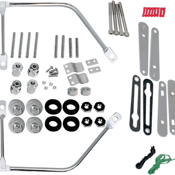 Caracteristicas: Designed to attach/detach all Saddlemen saddlebags and any rigid-back aftermarket and OEM saddlebags with a twist of the QTL (Quarter Turn Locking) fasteners Complete kit includes docking posts and fasteners, turn signal relocator and support bracket Docking posts and fasteners replace fender strut bolts and allow you to put on or take off saddlebags with a quick twist of the QTL (Quarter Turn Locking) fasteners; includes four docking posts with fasteners, spacers, saddlebag grommets, support clips, nuts/bolts/fasteners needed and instructions Docking post kit should be used in conjunction with Saddlemen saddlebag support bracket; can be used to mount OEM H-D and H-D accessory saddlebags (except 1200S bags) without purchase of additional bracket Support bracket kit includes two chrome-plated steel saddlebag supports and comes with an assortment of 5/16" and 3/8" fasteners in lengths to fit the most popular H-D models and aftermarket accessories