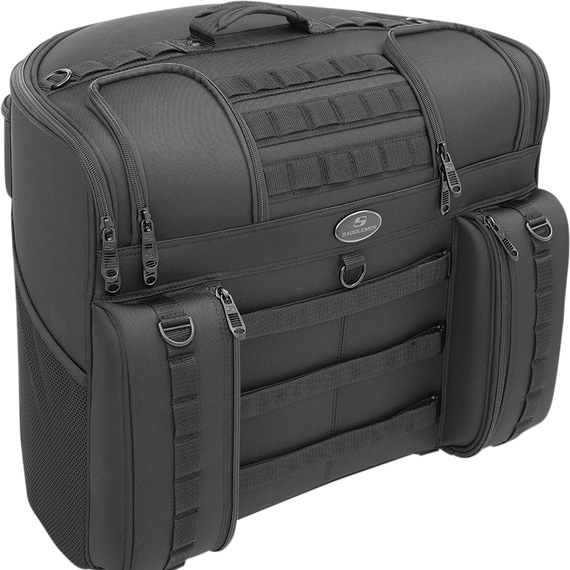 Caracteristicas: Strong, nylon meshing zipper teeth with black sliders equipped with large pulls for easy use even when wearing gloves Constructed of UV-, water- and weather-resistant 1200-denier SaddleTuff™ and leather-like vinyl panels Multiple oversized mounting rings around the bag overcome unique mounting challenges Designed to fit perfectly between the rider and tour pack Reflective rain cover with locking cinch cord included Integrated MOLLE attachment mounting option Holds shape even when empty Four external pockets