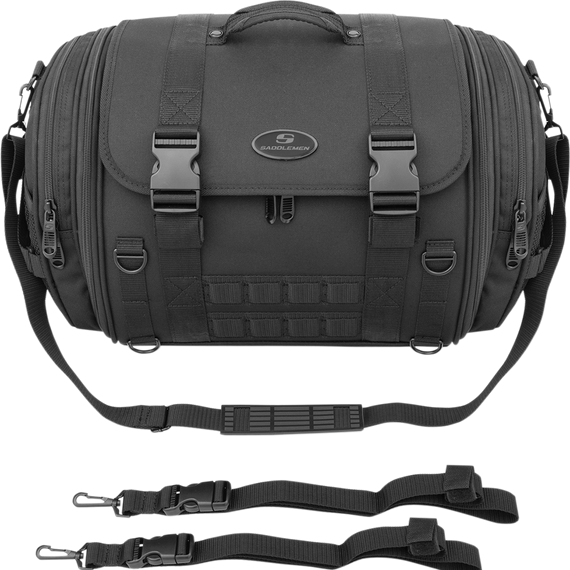 Caracteristicas: Dimensions: 18" wide x 11" deep x 10.5" tall (with an additional 3” expansion) Cubic Inches: 2,300 UV-rated, weather-resistant 1200d chassis Maintains shape even when empty Wide zippered center opening assures ease of loading with large jacket or gear flap End pockets expand out providing additional packing room when needed Internal molded organizer and zippered mesh pockets keep items organized Easy-mounted to sissy bar plus full mounting strap kit for a variety of mounting options All strap end include our unique keepers system which eliminates the need for cutting after the bag is installed Multiple heavy-duty D-Rings for additional mounting or attaching options Integrated MOLLE modular attachment points for storage customization Includes removable shoulder strap and carrying handle for transportation ease Includes tethered rain cover for added protection from the elements