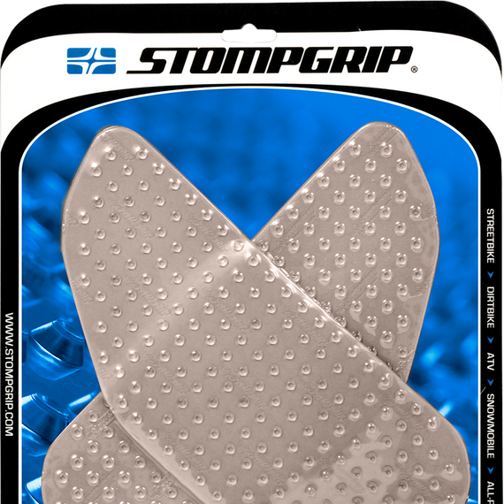 Caracteristicas: Make gripping your ride incredibly easy for increased bike control with more contact between bike and rider Provides more lower body grip and less upper body stress Ultra-clear proprietary elastomer material means paint and graphic remain visible through traction pads Non-abrasive material; designed to wear down and be replaced like a tire Will not wear down leathers as compared to grip tape Pre-molded with rounded edges that resist peeling Super-strong 3M™ peel-and-stick adhesive Made in the U.S.A.